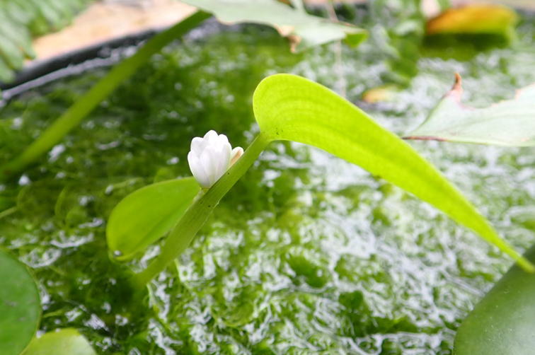 コナギMonochoria vaginlis ミズアオイ科の1年生の水田雑草。イネのともに東南アジアから渡来してとされる自然帰化植物。花期は8 - 11月。葉柄の基部に短い房状の穂を出し、青紫色の花をつける。まれに白花がありシロバナコナギ(form. albiflora Sskata)とよばれる。神奈川県では海老名市と愛川町で記録がある。本株は厚木市の稲刈りの終わった水田で見つけた。花は蕾の状態でほとんどが閉鎖花だった。わが家の睡蓮鉢では毎年発生するがめったに開花せず、閉鎖花のまま結実して水に沈んでしまう。 (2025-11-15) |