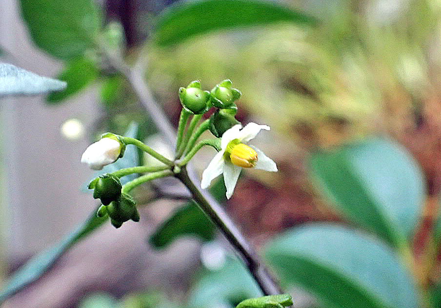 | アメリカイヌホオズキ わが家の側溝蓋の間から芽生えた。しばらくそのまま放置。みるみる大きくなり50pほどに、花を付け実が熟してきた。さすが目障りジャマとなるので処分することにした。で、何者か調べてみた。イヌホオズキの予想だったが花冠の切れ込み具合、実の付き方、種の数などでアメリカイヌホオズキと同定した。本種は北アメリカ原産。畑や路傍、河川敷、荒れ地などに普通にみられるがほかのナス属との見分けが面倒だ。 |
